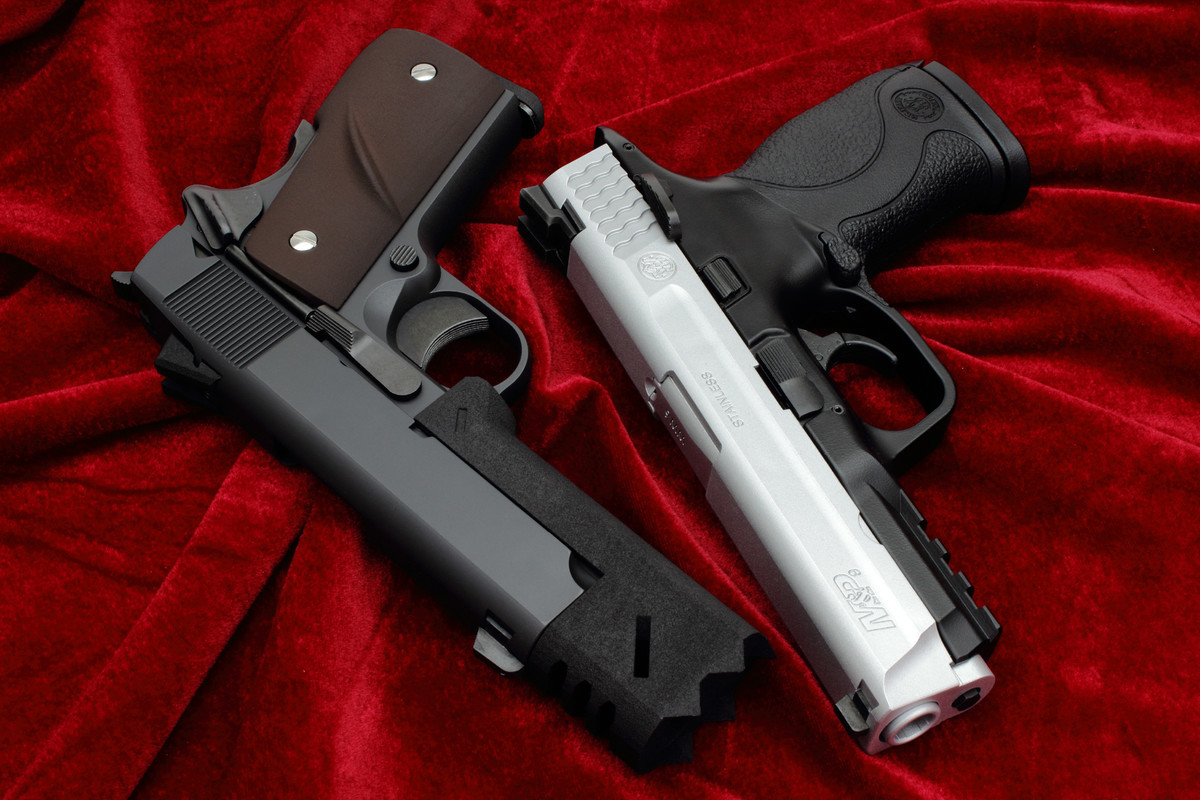 たきなのM&P風と一緒に。家にあったので勢いでスライド塗っちゃいました。作中ではサイトも銀色っぽいのですが、とりあえず実銃の文法で黒いままにしています。